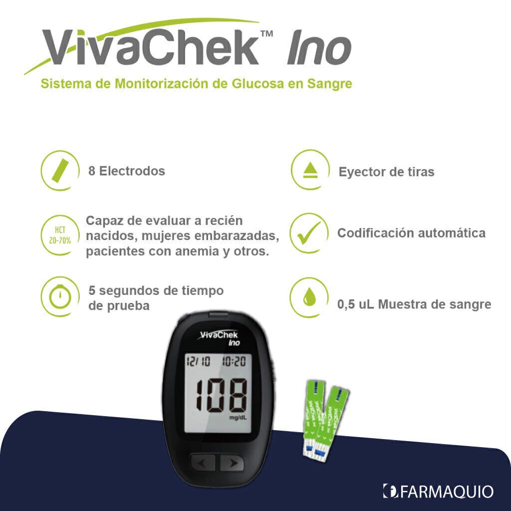 Medí tu glucosa con confianza. Resultados en segundos.El Vivachek Ino es un glucómetro confiable, práctico y aprobado por ANMAT, que ofrece resultados en solo 5 segundos con una gotita de sangre mínima. Diseñado para el uso diario, brinda resultados precisos gracias a su sistema de 8 electrodos y auto calibración.🔍 ¿Por qué elegirlo?